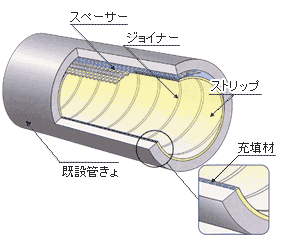 開削せず、スピーディに大口管渠を蘇らせる、環境にやさしい工法です。 硬質塩化ビニル製の帯板(ストリップ)を既設管渠の内面にスパイラル上に巻き立て嵌合用部材(ジョイナー)を使って製管します。 こうして出来たストリップ管と移設管渠の空隙に充填材を注入する事で、 移設管渠と更生部材が一体となり、強度アップを実現します。 |
